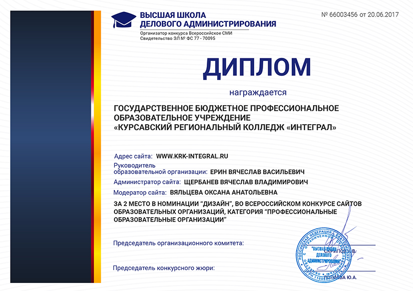 | 2017 год | Включен в Единый Национальный Реестр ведущих образовательных учреждений РФ (по состоянию на 2016 год) Официальный сайт награжден дипломом за 2 место в номинации "Дизайн" во Всероссийском конкурсе сайтов образовательных организаций, категория "Профессиональные образовательные организации" Включен в Национальный Реестр «Ведущие образовательные учреждения России-2017» |