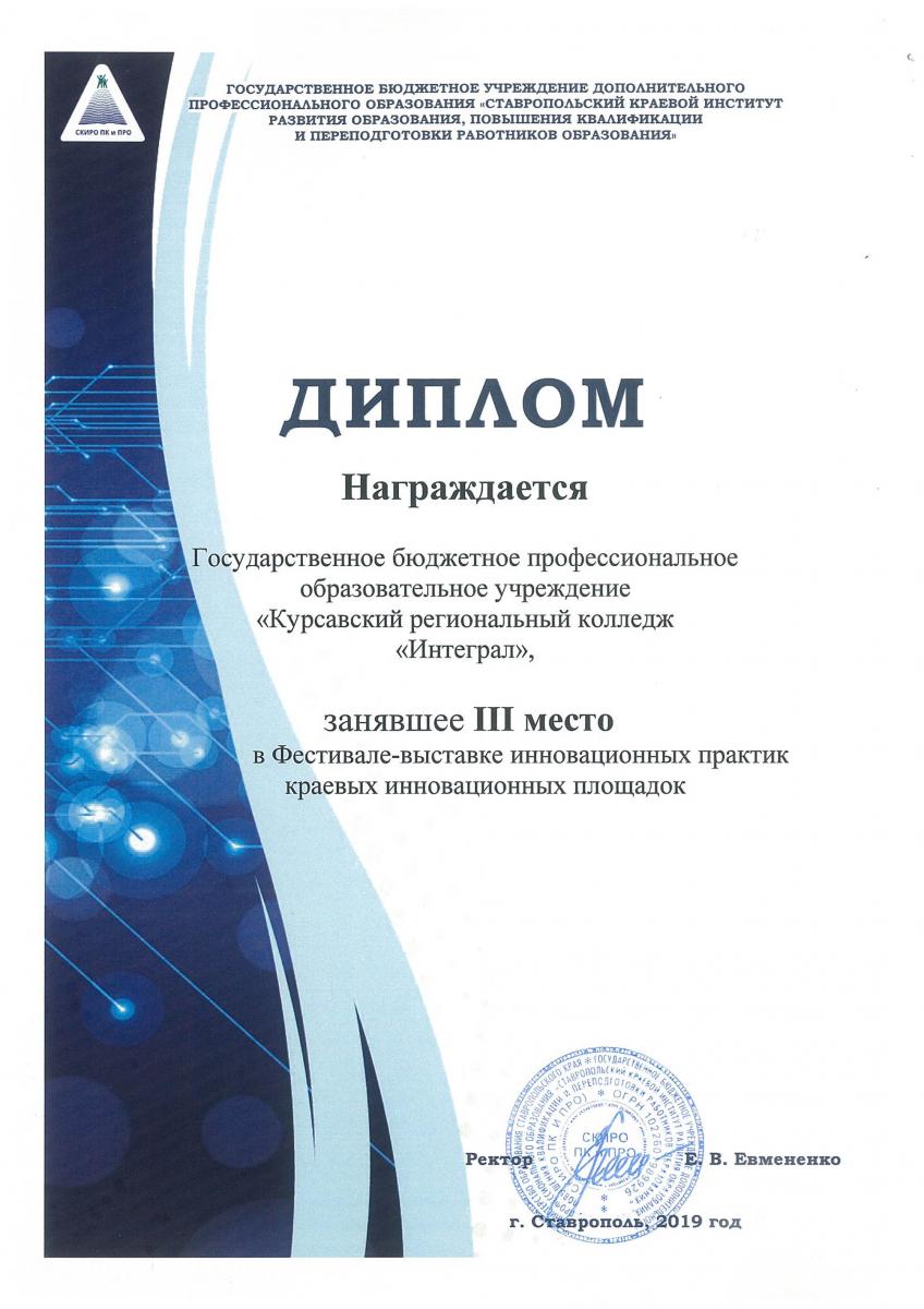 - Диплом за III место в Фестивале - выставке инновационных практик краевых инновационных площадок