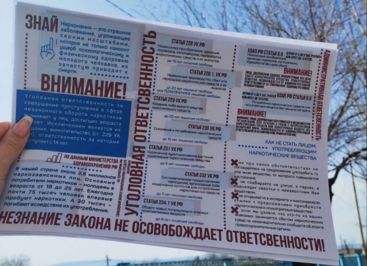 В ходе акции студентам были розданы информационные памятки, содержащие полезную информацию о признаках наркотической зависимости, способах противостояния давлению, а также информацию о юридической ответственности за хранение, распространение и употребление наркотических веществ.