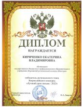 Студенты колледжа регулярно принимают активное участие в этом конкурсе, показывая хорошие результаты. Не исключением стал и этот год. В номинации «Рецепт счастливой семьи» с очень интересной работой «Семья, достойная подражания» победителем регионального этапа конкурса стала студентка группы Э-18 Кириченко Екатерина и награждена дипломом.