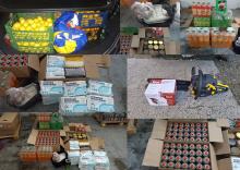 продукты питания (сало, чеснок, вода, различные консервы, ящики с фруктами)
