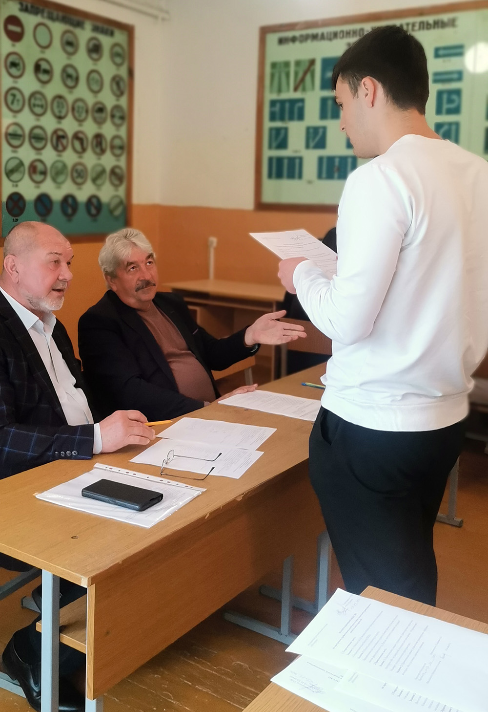 Экзаменационная комиссия состояла из представителей предприятий, организаций, учреждений соответствующего профиля. Экзаменационную комиссию на право управления транспортными средствами по профессии «Водитель автомобиля» возглавил Хворостянский Ю.В.- директор МБУ Единая Дежурно-Диспетчерская Служба Андроповского Муниципального Округа. Шляпников Р.Е., системный администратор ПТП «Андроповское» принимал экзамен у обучающихся по профессии «Оператор электронно-вычислительных и вычислительных машин». Знания и практические работы будущих работников сферы питания по профессии «Повар» оценила Пономарева Е.Н., индивидуальный предприниматель.