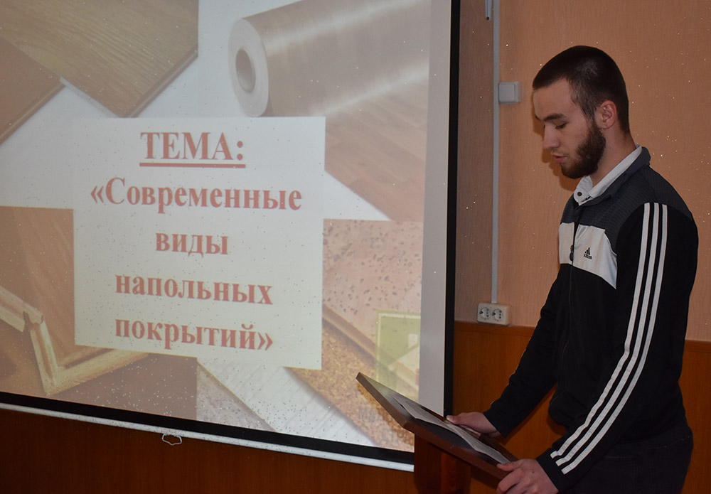 21 апреля 2022 года в Курсавском региональном колледже «Интеграл» проведено внеаудиторное мероприятие по теме «Виды напольных покрытий» в рамках фестиваля «Профессиональный хит-парад» по специальности 08.02.01 «Строительство и эксплуатация зданий и сооружений» (группы Ст-35, Ст-25). В организации и проведении внеаудиторного мероприятия приняли участие: ведущие – обучающиеся Порядный Андрей, Романенко Даниил и преподаватели - Головань Е. З., Медяник А.В., Каширин А.В.